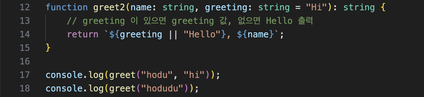 function greet(name: string, greeting: string = 'Hello'): string {