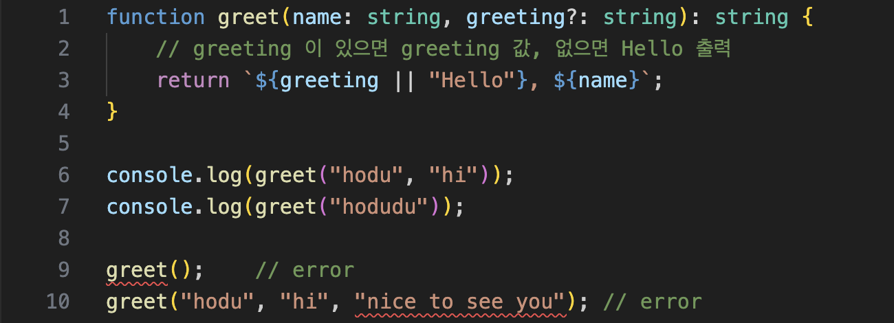 function greet(name: string, greeting?: string): string {