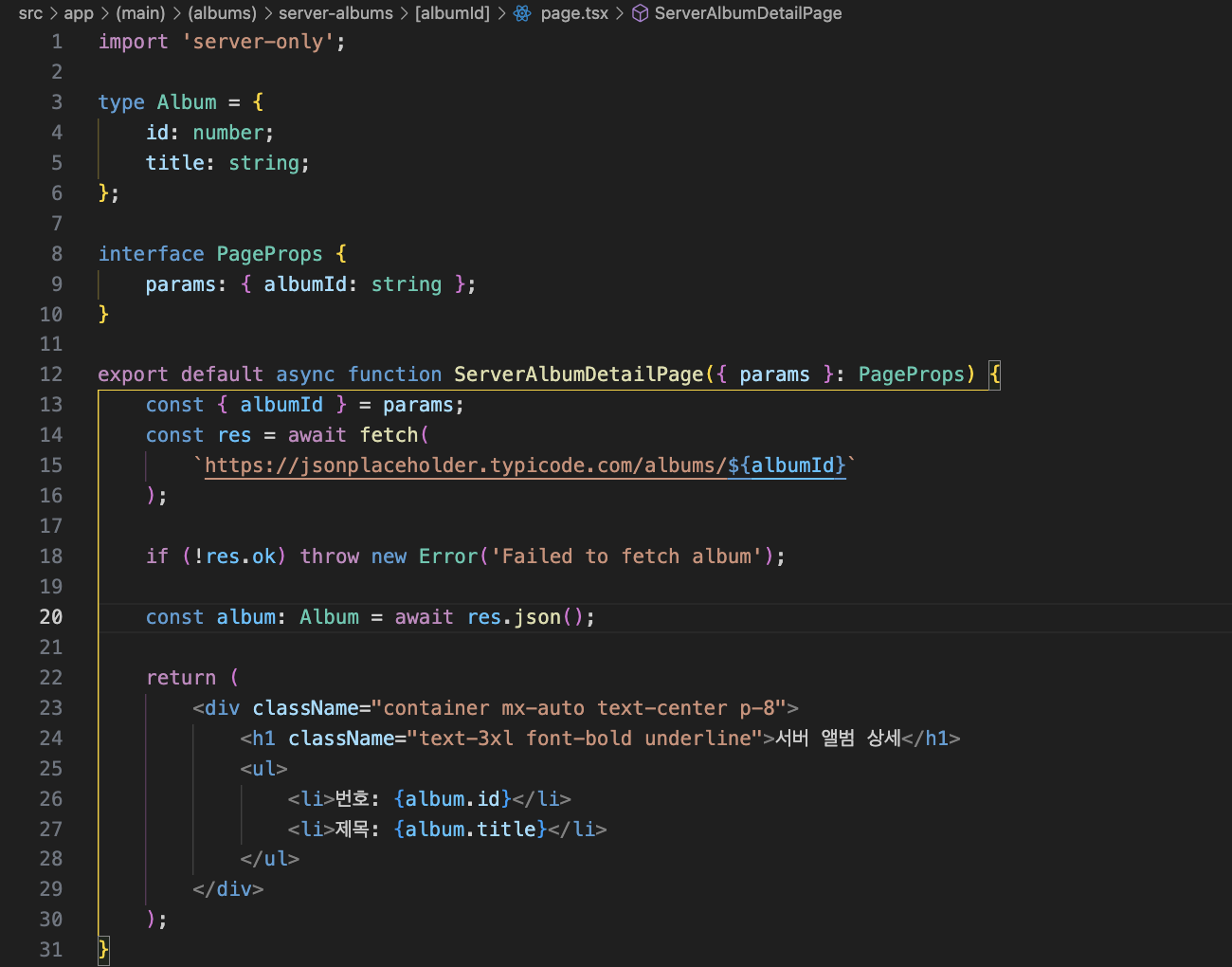 서버에서 실행되는 컴포넌트이다. 페이지가 생성될 때마다 fetch 가 실행되고 HTML 이 완성되어 클라이언트로 전달된다. 클라이언트는 이미 HTML에 앨범 정보가 들어 있으므로 바로 화면을 볼 수 있다. SSR or SSG 처럼 동작한다.