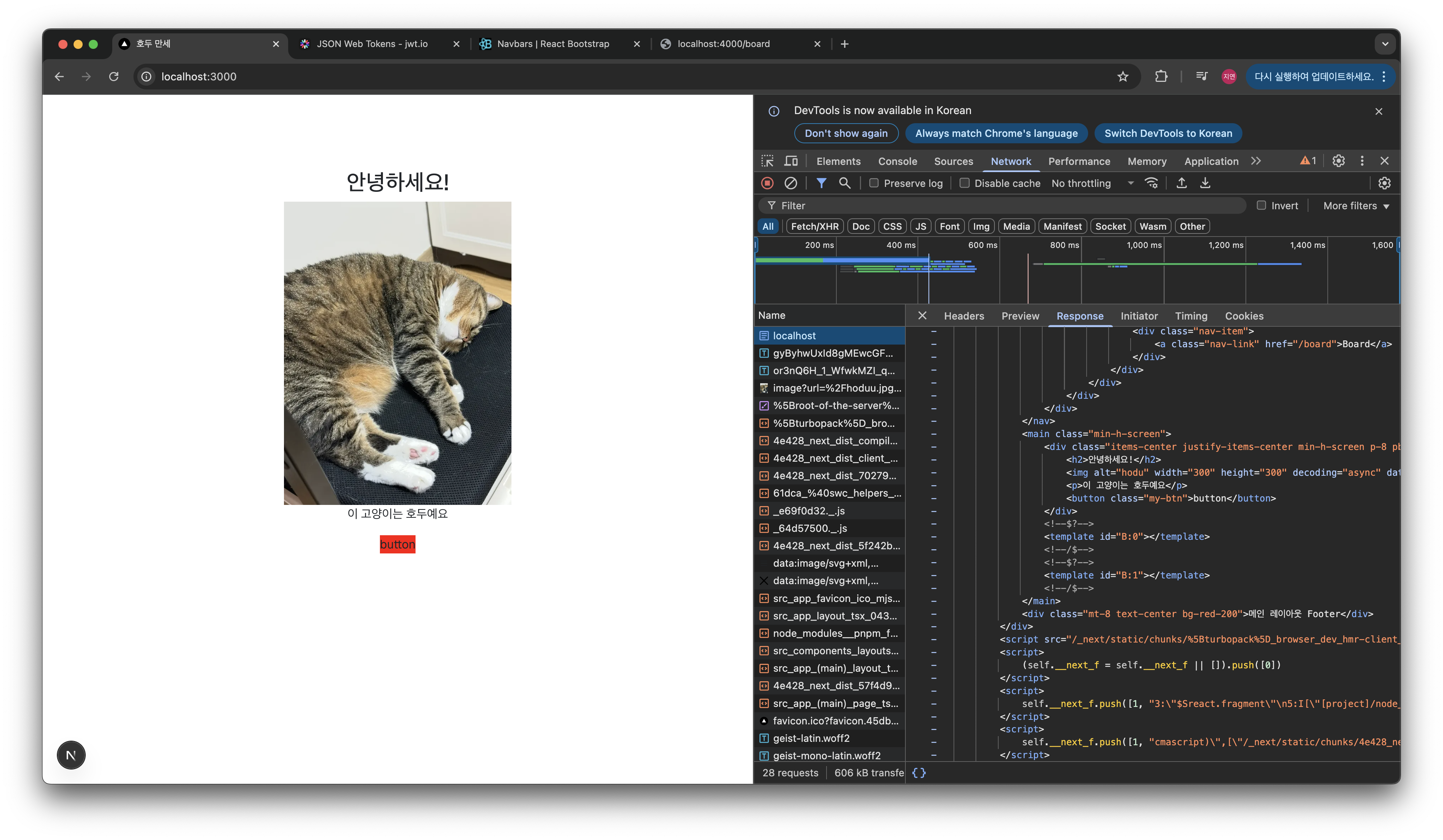 5. 크롬 네트워크 탭에서 (localhost:3000) 요청에 대한 응답을 확인하세요. (html이 비어있는지 생성되어 있는지)