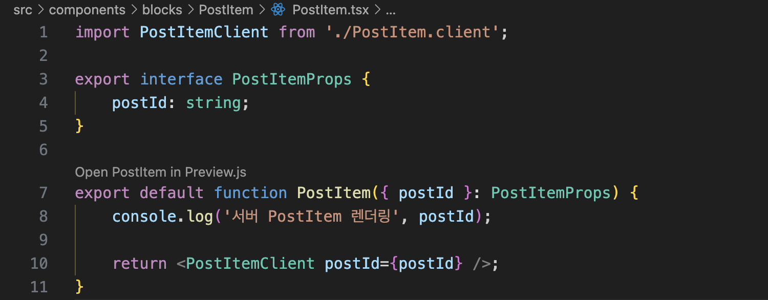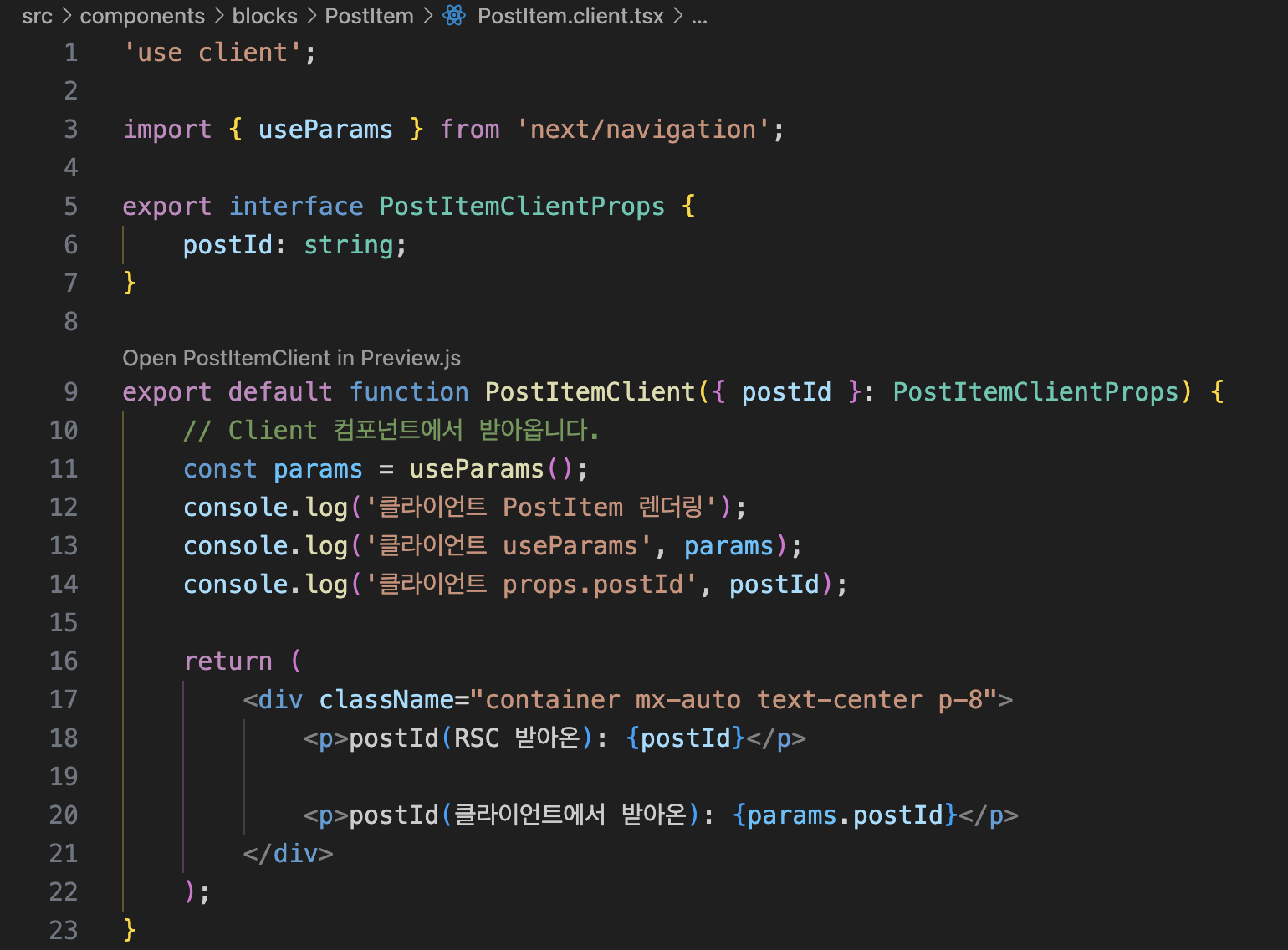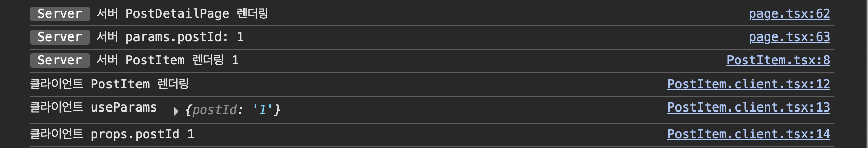 - 서버 컴포넌트에서 이 postId를 받아 <PostItemClient postId={params.postId} /> 형태로 클라이언트 컴포넌트에 넘김