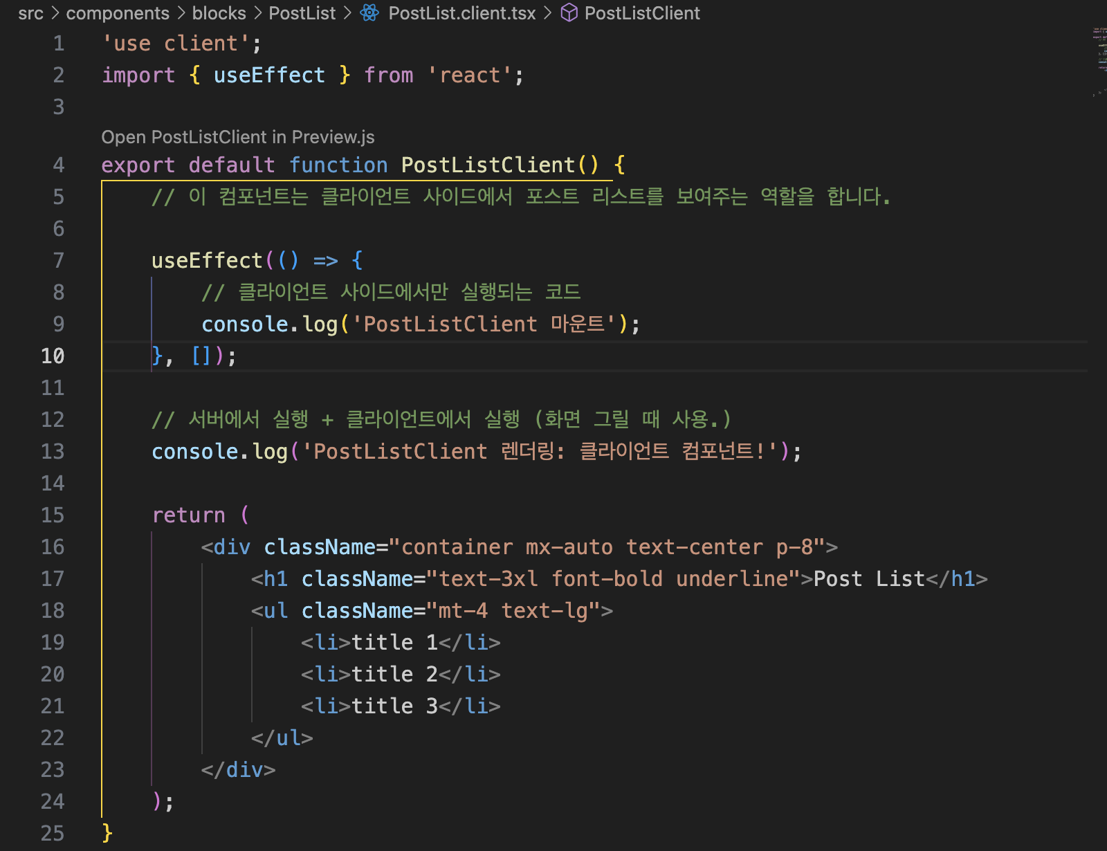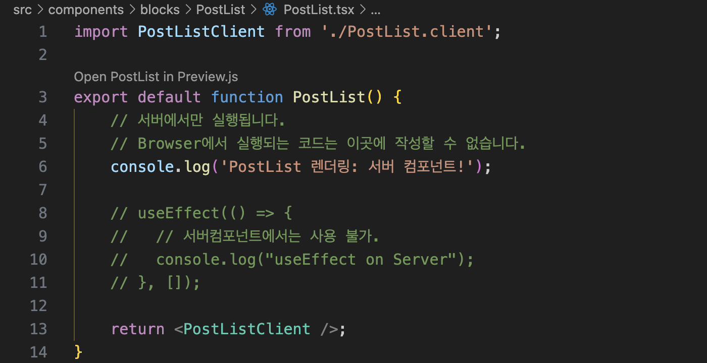 우리는 앞으로 server 에서 띄울 페이지는 PostList.tsx, 클라이언트에서 보여줄 페이지는 PostList.client.tsx 로 구분해서 작성하기로 했다.