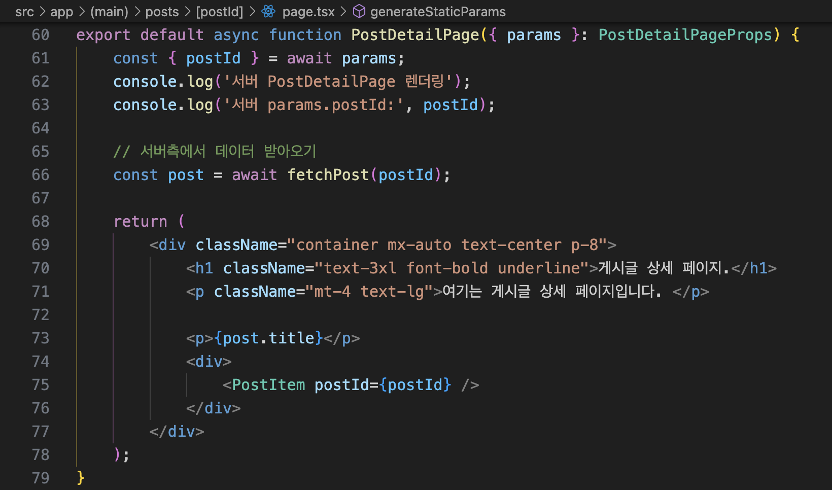 - 사용자가 /posts/1 요청 → Next.js가 해당 경로를 파싱하여 params = { postId: '1' } 를 props로 자동 전달(클라이언트에서 따로 추출할 필요 없이 컴포넌트 함수의 인자로 바로 사용이 가능하다)