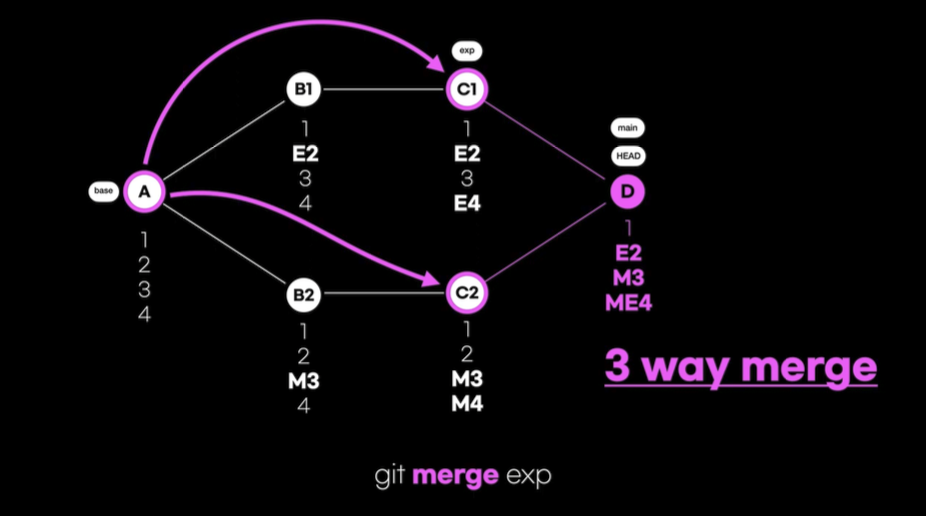 : 공통 조상(Base) + 두 브랜치의 최신 상태(HEAD & Merge)를 비교해서 자동 병합하는 방식